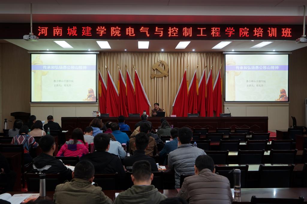 在开班仪式上,愚公移山干部学院副院长梁翠花发表了热情洋溢的欢迎辞,为全体学员介绍了济源市的地理风貌、人文历史等情况及愚公移山精神的历史渊源。此次培训主要采取专题讲座、现场教学和体验教学等方式进行。在专题讲座中,愚公移山干部学院郑太升老师为学员们讲解了“愚公移山”如何从一则寓言上升为一种民族精神,深刻领会了愚公移山精神的内涵和新时期弘扬愚公移山精神的重要意义。在随后的研讨会上,电气学院教师和学生就如何转变观念,在教学和学习中践行愚公移山精神展开热烈的讨论。