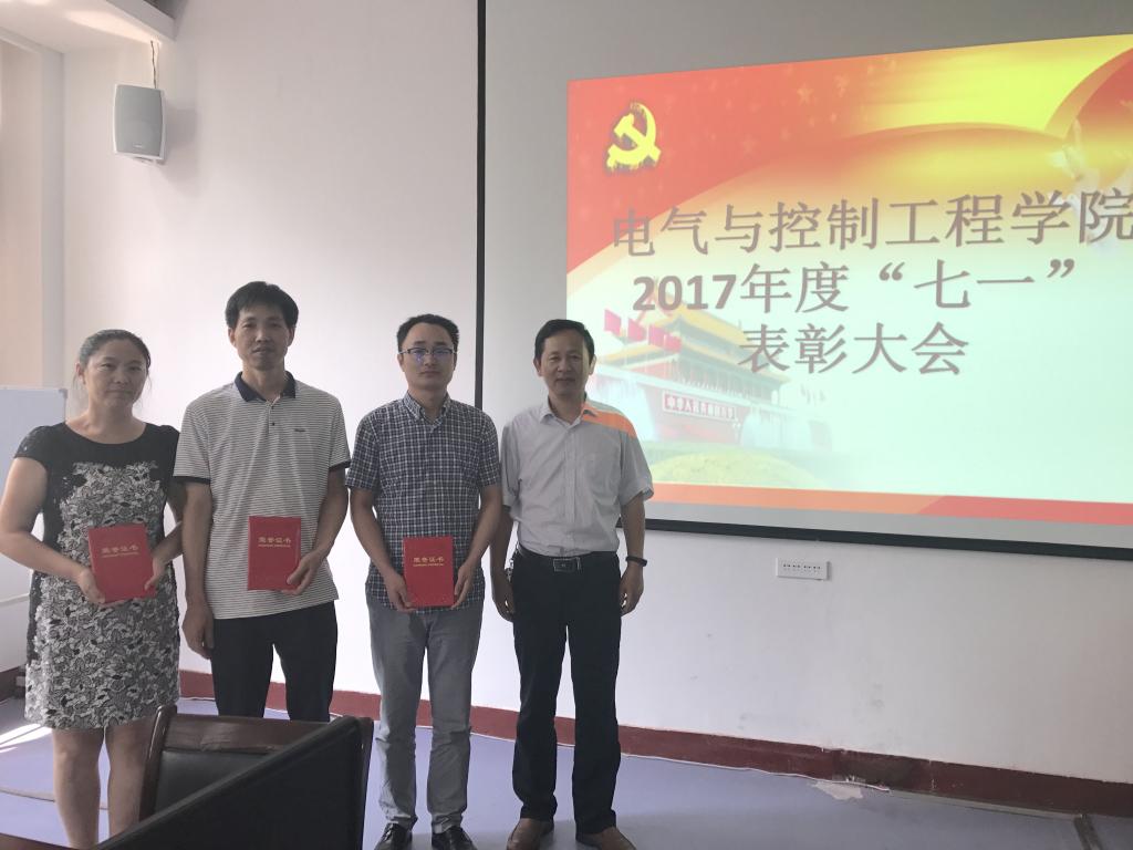 樊晓虹院长总结了一年来,yl6809永利集团党组织及电气学院全体党员教师坚持以党的十八大、十八届三中、四中、五中、六中全会和习近平总书记系列重要讲话精神为指导,深入开展“两学一做”学习教育,充分发挥政治核心人物、战斗堡垒和先锋模范作用,为推进学校转型发展,学院学科专业建设,以及内涵提升、专业转型发展、人才培养方案制定等工作做出了贡献。电气学院有3名教工党员和5名学生党员被评为优秀共产党员,1名教师被评为优秀党务工作者,yl6809永利集团党总支被评为先进基层党总支,并宣布了先进基层党组织、优秀党务工作者和优秀共产党员名单。之后,樊晓虹院长为优秀党务工作者办法荣誉证书,孙炳海副院长为优秀共产党员颁发荣誉证书并合影留念。