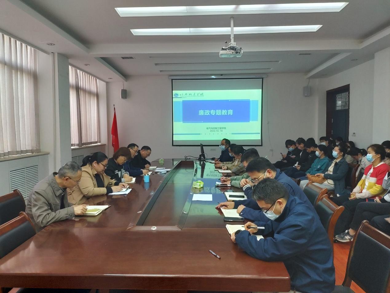 (通讯员 王旭红)为进一步巩固能力作风建设年活动成效,结合我校第六届廉洁文化教育月活动廉政教育安排,10月18日,电气学院开展廉政专题教育,班子成员、全体教职工参加会议,会议由学院党委书记杜留记主持。