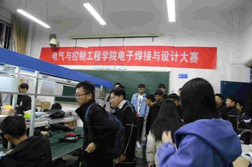 屋外寒风凛冽,而屋内却洋溢着了激烈的比赛氛围,参赛同学全神贯注的用双手焊接起自己兴趣,小心翼翼的使用电烙铁将二极管焊入电路板中,全体同学以严谨的态度一丝不苟的精神用自己灵巧的双手焊接出自己对于动手之美的感悟,旁边的学长们积极的服务参赛同学,帮助解答同学们的一些实验问题。同学们在比赛过程中发挥自己的聪明才智,勇于用新方法进行焊接,赢得学长们的称赞。