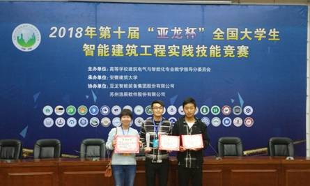 我校电气学院选派由张晓杰、田巍、梁宁一三位老师指导,建筑电气与智能化专业曹松林、袁凯鑫同学组成yl6809永利集团代表队,在三天的竞赛过程中,经过实践技能、智能建筑电气设计两个环节的比拼,再获团体二等奖,曹松林、袁凯鑫同学均获电气设计单项三等奖。