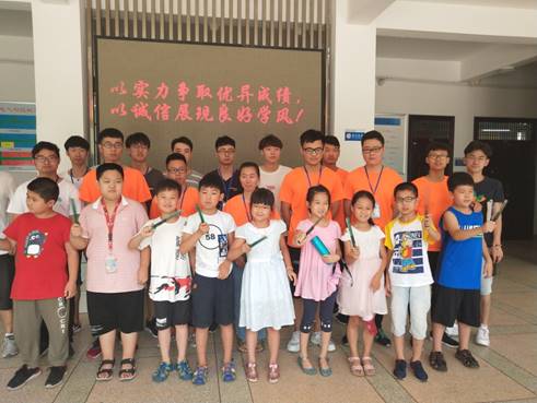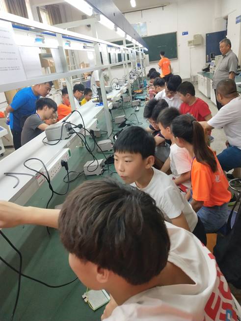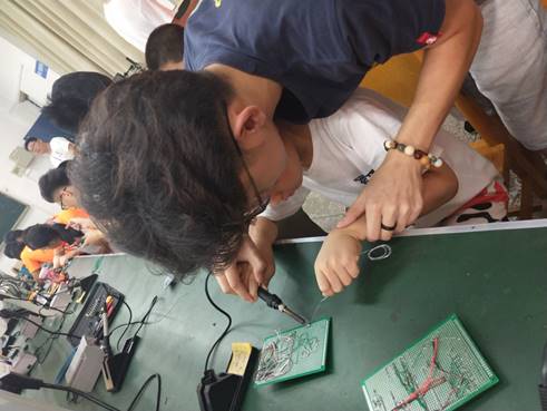 在进实验室之前,志愿者们先对小学生们讲述进实验室之后的注意事项,进了实验室后要服从指挥,不要乱碰实验室里的物品。紧接着,志愿者们就带领着小学生们进了实验室,并且一对一对他们讲解焊接知识,手把手教他们焊接。在志愿者们的不懈努力下,每个小学生们都掌握了基本的焊接知识以及焊接手法。最后,志愿者们与所有小学生们合影留念。