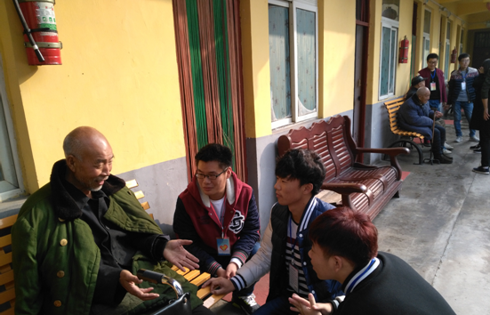 到达敬老院后,志愿者们首先送上为老人购买的水果并对敬老院进行了清理打扫,使有点破败的院子焕然一新。随后志愿者帮助老人清洗了积攒的衣物,陪老人聊天。老人讲述他们一个个亲身经历的故事给涉世未深的志愿者以人生启迪,同时老人也被志愿者分享的校园趣事而逗乐,不时发出爽朗的笑声。平时寂静的敬老院因为大家的欢声笑语而变得生机勃勃。
