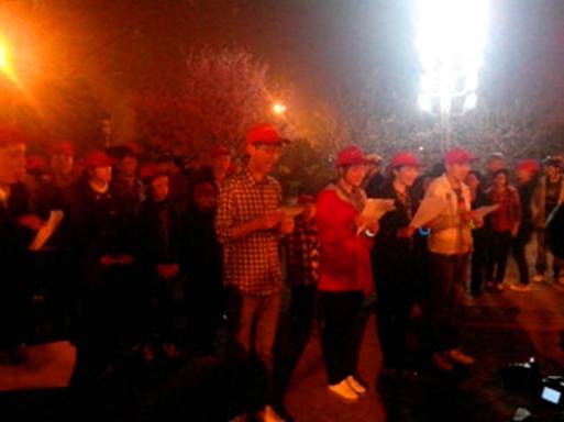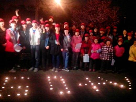 晚上7点10分志愿者赶往鹰城广场,半个小时后积极投入到活动中,热情地组织前来的人员签到,声情并茂的朗诵诗歌,从容耐心的向从四面八方过来的人员讲解本次活动。八点钟的鹰城广场已是人山人海。之后,我们点燃蜡烛,摆成象征“地球一小时2013-我做绿V客”的“60+V”形。共同期待着8点30分:鹰城广场所有的灯熄灭了!期间有一个人说:“平顶山的星星更多更亮了!”九点半,披着月光我们返回学校,虽然路黑了,但我们的心更亮了。