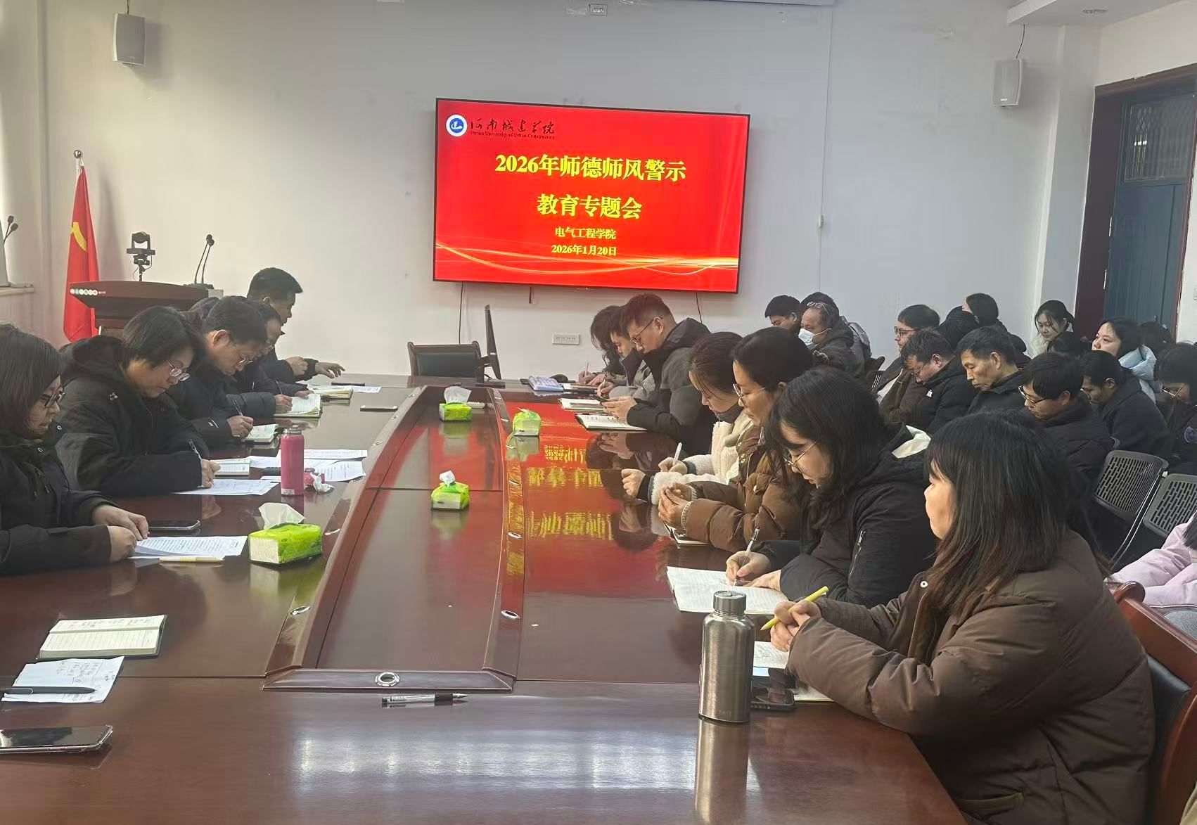 (通讯员 于晓飞)为进一步加强师德师风建设,落实立德树人根本任务,规范教师职业行为,2026年1月20日,电气工程学院在善思楼313会议室召开师德师风警示教育专题会议,全体教职工参加了此次会议。会议由学院党委书记郑化浦主持。