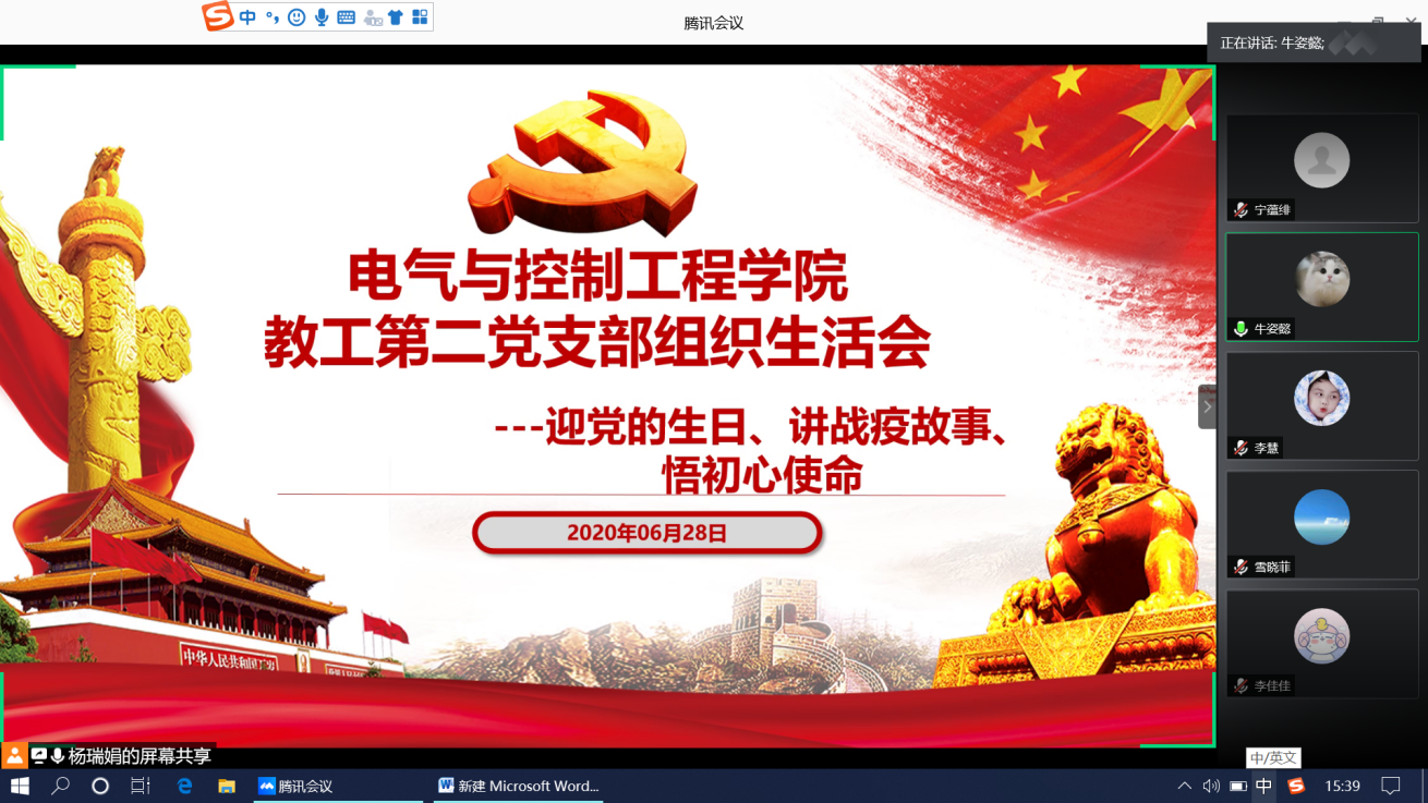 教工二支部由党支部副书记杨瑞娟同志主持,会议中,支部党员同志们依次讲述了发生在“疫情”期间身边平凡人身上发生的感人至深的故事,有发生在电气学院的、有发生在居住小区的,也有发生在身边亲人身上的,这些故事使参加活动的党员同志们的内心受到了洗礼。同时,每位同志依次对照先进人物和先进事迹,进行自我剖析,从自身找问题,剖析问题根源,制定整改方向。