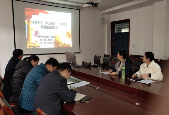 (通讯员吴雨泽)根据学院党总支工作安排,结合本支部实际,电气学院教工第一党支部于12月6日在2号教学楼B313召开了“不忘初心、牢记使命”专题组织生活会,一支部全体党员参加了此次会议。学院领导班子成员以普通党员身份参加了此次专题组织生活会。会议由教工第一党支部书记祁林主持。