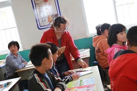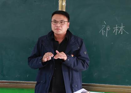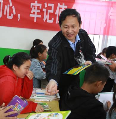教工一支部书记孙炳海给学生发放书籍和学习用品