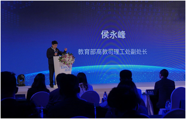 本次高峰论坛的主题是“融合·谋远·创未来”。教育部高教司理工处副处长侯永峰致辞,他对当前新经济形势做了剖析,强调了当前高校专业的两大改革方向:一是面向新技术领域的特色专业的设立,一是传统专业的转型升级,并指出,产学合作协同育人是解决这一问题的长效机制,出路是高校与实力型的企业合作。