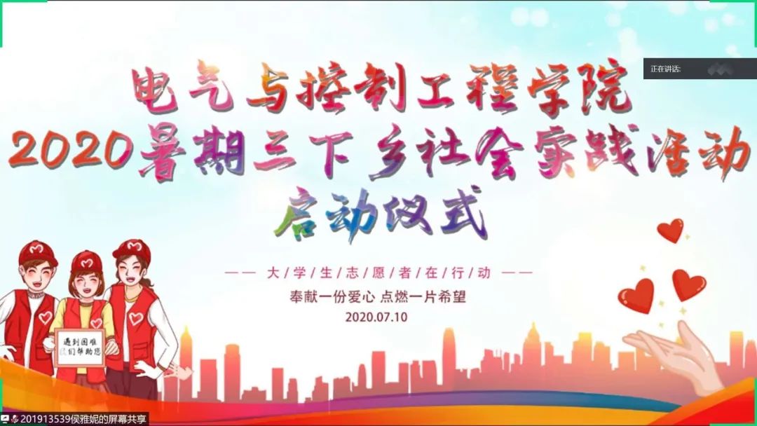 (通讯员 李昕怡   吴雨泽)为深入学习贯彻习近平新时代中国特色社会主义思想,学习贯彻党的十九大和十九届二中、三中、四中全会精神,组织引导广大青年学生扎根中国大地,了解国情民情,生动感悟新时代青年肩负的历史使命,增强“四个意识”、坚定“四个自信”、做到“两个维护”,积极响应习近平总书记对全国各族青年的寄语精神,以实际行动建设祖国、服务人民,结合疫情防控常态化要求,2020年7月10日,电气学院以线上线下混动会议形式召开了2020年暑期“三下乡”社会实践活动启动仪式。党总支书记董燕飞、党总支副书记宁蕴绯、团总支副书记、学工办副主任徐娟、实践团队指导教师及社会实践活动队员参加了此次仪式,启动仪式由徐娟主持。