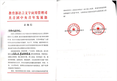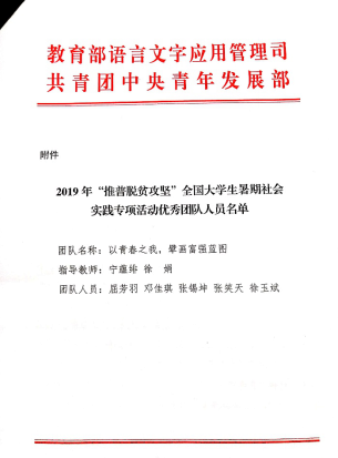 此团队是2019年暑假,由我院宁蕴绯、徐娟两位老师带队,屈芳羽、邓佳琪、张锡坤、张笑天、徐玉斌等同学共同参加的推普脱贫攻坚活动,深入青海、甘肃等地开展推普脱贫工作,在当地进行普通话培训、政策宣讲、问卷调查等。活动过程受到教育部、团中央中青网、“推广普通话”官方微博、微信公众号、河南省教育网等国家级、省级媒体报道。