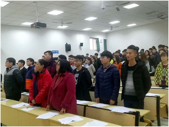 (图为与会的领导老师与代表们在庄严的国歌声中肃立)
