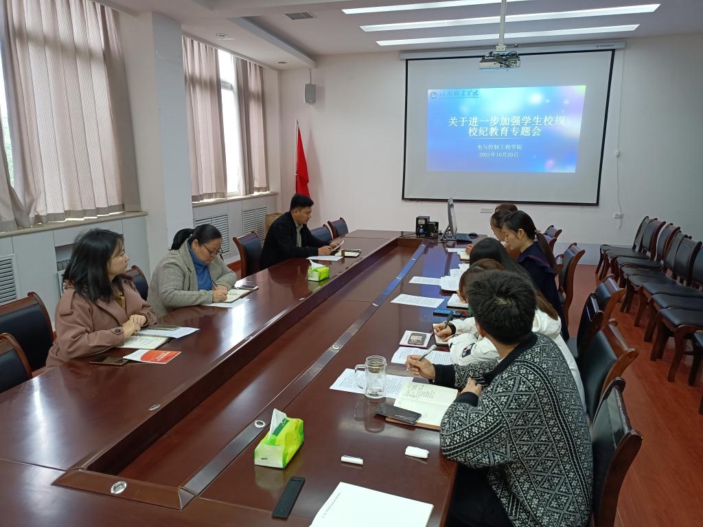 (通讯员 张敬雨)为进一步做好学生教育管理工作,使广大同学自觉规范行为、遵守校规校纪、建设文明和谐校园,电气学院于2021年10月20日上午,在学院会议室召开进一步加强学生校规校纪教育专题会议。学院党委副书记宁蕴绯、团总支副书记、学工办副主任徐娟、陈伟和全体辅导员参会,会议由宁蕴绯主持。