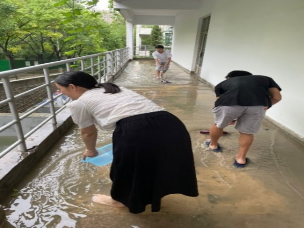 特大暴雨造成了教学楼积水。学院值班老师庞凯歌、杨瑞娟带领留校学生全力开展校园排险工作,不惧风雨,全面排查积水点,不畏艰险快速疏通下水道,有序有效地进行险情排查。