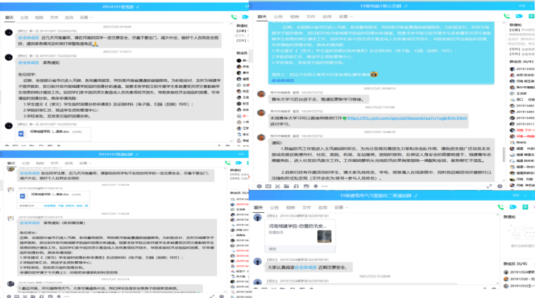面对突如其来的汛情,学院党委要求全体辅导员对所带学生召开安全班会,并对灾情严重地区学生进行关心关怀,确保全体学生能联系到、能叮嘱到、能反馈到。