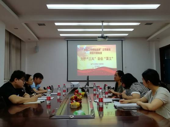 (通讯员 宁蕴绯 徐娟)5月18日,学校学生工作“特色品牌”创建活动办公室第三检查组组长樊昀英,成员温啸野、杨冰一行到我院针对我院2017年立项的 “学生工作特色品牌”——力行“三风”,主创“国文”进行了中期检查。学院党总支副书记董燕飞、学工办主任团总支书记宁蕴绯、专职辅导员徐娟、赵昊参加了检查会议。