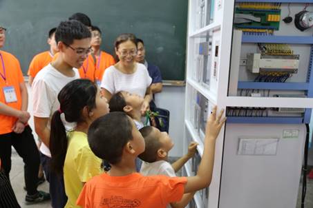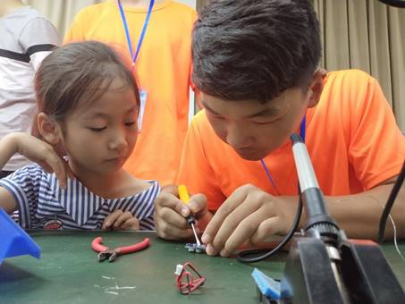 志愿者们首先带领小学生们参观了发电系统,紧接着志愿者们又带领小学生去参观建筑智能实验室,在建筑智能实验室里志愿者通过机器的原理和运行方式对小学生们进行讲解。然后,志愿者们又给小学生们介绍了机器人,飞思卡尔智能车。讲述他们的工作原理,阐述了他们的性能,更是现场演示了一下。接着,志愿者于2号教学楼A109对小学生们进行一对一的焊接知识讲解和手把手的焊接辅导。在志愿者们的不懈努力下,每个小学生都掌握了基本的焊接知识以及焊接手法。