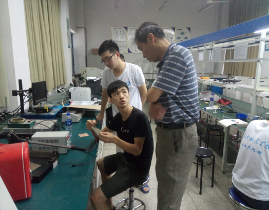 实践团的成员通过自行选题、购买元器件后,正式开始了焊接制作。成员们来自不同的年级,互相帮助,积极讨论。为了解决学生们所遇到的问题,学院党总支书记赵静生和团总支书记宁蕴绯来到了实验室为正在动手制作的暑期实践团成员们进行了现场指导,解决了同学们焊接过程中所遇到的一些难题,并为大家的作品提出了一些建议和意见,鼓励同学们更快更好的完成接下来的实验任务。老师还和同学们进行了交谈,并叮嘱了相关实验的注意事项,大家也对接下来的实践活动更加有了信心。