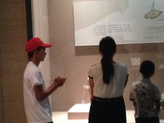 蓝阳服务队的队员从学校出发,步行来到博物馆。按照事先和博物馆负责人做好的安排,把队员分配到各个展厅,为参观的游客进行讲解、引导等服务,并维持馆内的参观秩序。服务队的队员在服务的过程中劝阻游客使用闪光灯、提醒孩子禁止在大厅嬉戏奔跑,对于前来问路的游客,队员也是积极的指引,服务队做出的点点滴滴让整个博物馆都充满了文明和谐的气息。