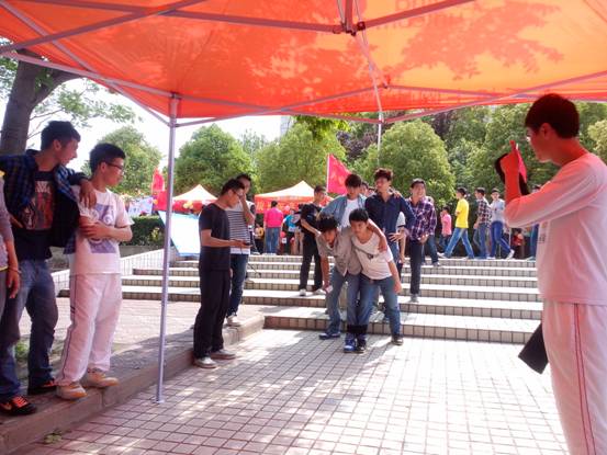 伴随着活动的开始,电气学院的帐篷前排起了长长的队伍。参与者在准备的过程中,相互讨论游戏技巧与动作要领,玩的不亦乐乎。跌倒了,站起来从头来过;失败了,手挽手一起加油;成功了,兴高采烈开心不已……加油声、欢呼声、音乐声交汇在一起,让校园变成欢乐的海洋,使校园里洋溢着蓬勃的朝气与青春的活力。