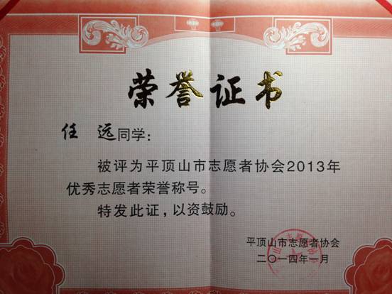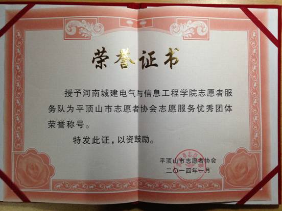 (通讯员:宁蕴绯 高炳尧)3月1日,yl6809永利集团青年志愿者协会被平顶山市志愿者协会授予“平顶山市志愿者协会志愿服务优秀团体”荣誉称号,王成龙、刘向伟、任远、高炳尧等10名电气学院志愿者获得“平顶山市志愿者协会2013年优秀志愿者”荣誉称号。