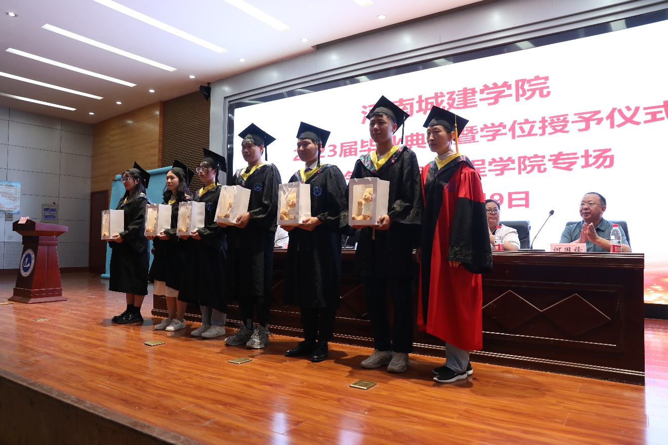 典礼在庄严雄壮的国歌声中拉开帷幕。学院领导分别宣读了校级优秀毕业生、学院2023届优秀毕业设计(论文)的表彰决定、2023年度国家学生体育健康测试优秀获得者名单以及授予毕业生学士学位的决定,同时对获得校级优秀毕业生、学院2023届优秀毕业设计(论文)作者、2023年度国家学生体育健康测试优秀获得者进行了表彰。随后,副校长吴晓红、院长董燕飞共同为毕业生正冠拨苏、颁发学位证书并合影留念。