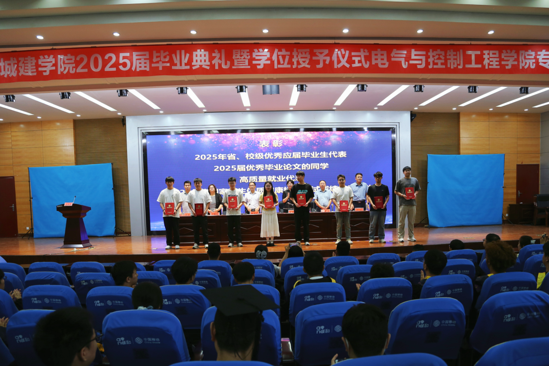 典礼在庄严雄壮的国歌声中拉开帷幕。yl6809永利集团党委副书记宁蕴绯宣读了2025年校级优秀应届毕业生、2025年度国家学生体质健康标准测试成绩优秀学生的表彰决定;yl6809永利集团副院长梁成武宣读了2025届优秀毕业论文作者的表彰决定,并对获得2025年省、校级优秀应届毕业生、2025届优秀毕业论文、高质量就业代表、2025年度国家学生体质健康标准测试成绩优秀学生代表进行了表彰。yl6809永利集团副院长祁林宣布了yl6809永利集团获得学士学位的2025届毕业生名单。随后,yl6809永利集团院长董燕飞、副院长何国锋共同为毕业生正冠拨穗、颁发学位证书并合影留念。