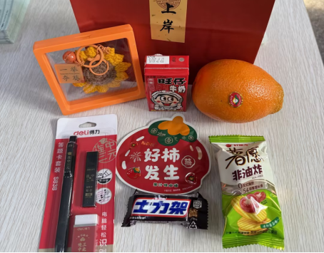 活动开始前,工作人员已将满载学院师生深情祝福的爱心礼品整齐摆放。涂卡笔“连中三元”三件套、寓意“橙功上岸”的橙子、寄托“好运旺旺”的旺旺牛奶、补充能量的士力架、象征“金榜题名”的“薯愿”薯片、刻有“一举夺魁”的钥匙扣及寓意“好柿发生”的橡皮糖,每一份礼品都暗藏巧思,承载着对学子的殷切期盼。活动现场,宁蕴绯为学子送上考前寄语,勉励大家在冲刺阶段坚守初心、毫不松懈,以最饱满的状态迎战考试;祁林激情鼓劲,鼓励同学们不畏艰难、放手一搏,高效利用剩余时间,用实力实现考研梦想。真挚的话语让在场学子倍感温暖、备受鼓舞。